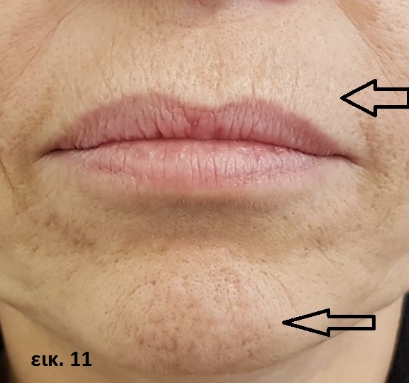 Στην περίπτωση των ρυτίδων καπνιστού το υαλουρονικό μπορεί όχι μόνο να τις «σβήσει», αλλά παράλληλα να προσδώσει ένα πιο σαφές περίγραμμα στο όριο του άνω χείλους, δημιουργώντας έτσι την ψευδαίσθηση ότι έχει αυξηθεί ο όγκος του, χωρίς στην πραγματικότητα αυτό να έχει συμβεί (εικ. 11, 12).