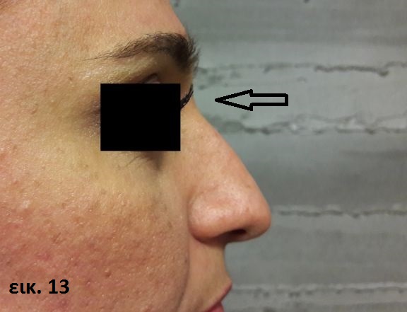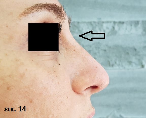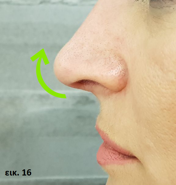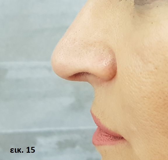 Θα πρέπει, βέβαια, να σημειωθεί ότι σ’ αυτή την περίπτωση μιλάμε αυστηρά για προσωρινό «καμουφλάρισμα» των ατελειών της μύτης, όπως για παράδειγμα μιας «καμπούρας» (εικ. 13, 14) ή της πτωτικής κορυφής της ρινός (εικ. 15, 16). Η συγκεκριμένη, μη- επεμβατική θεραπεία σε καμία περίπτωση δεν μπορεί να υποκαταστήσει τη ρινοπλαστική, η οποία μπορεί να δώσει οριστική λύση σε οποιαδήποτε δυσμορφία ή λειτουργικό πρόβλημα του ασθενούς.