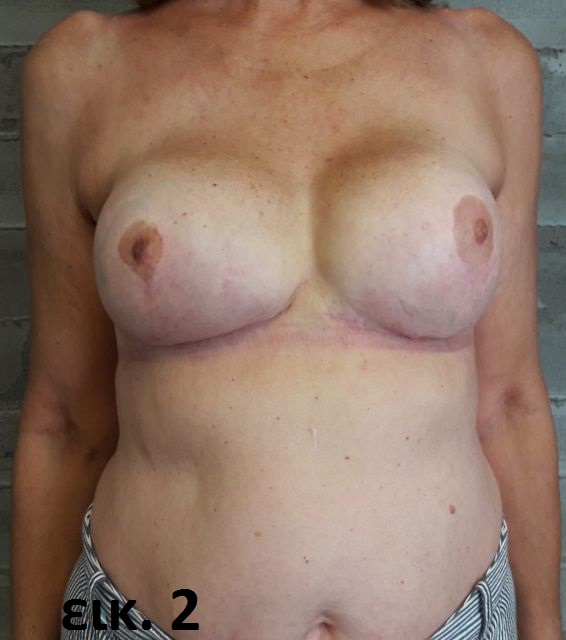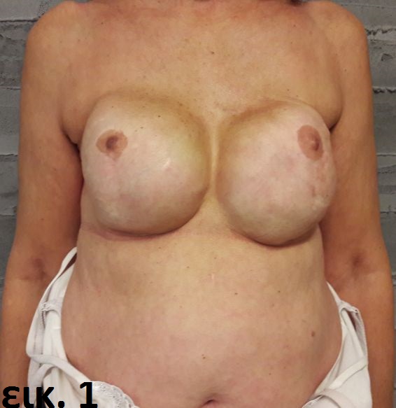 Η πρώτη ασθενής υπεβλήθη σε αμφοτερόπλευρη μαστεκτομή και άμεση αποκατάσταση προ 20ετίας. Προ 7ετίας ξεκίνησαν τα πρώτα προβλήματα (μικρή παρεκτόπιση), τα οποία επιτάθηκαν έκτοτε. Η ασθενής υπεβλήθη σε αντικατάσταση των ενθεμάτων, καψουλεκτομή, ανόρθωση μαστών, συμμετροποίηση θηλών και λιπομεταφορά στις παρυφές του μαστού (εικ. 3, προεγχειρητικός σχεδιασμός), για ομαλοποίηση του περιγράμματός τους.