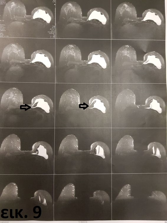 Η δεύτερη ασθενής υπεβλήθη επίσης προ 20ετίας σε αριστερή μαστεκτομή και τοποθέτηση μόνιμου ενθέματος. Τα συμπτώματα ξεκίνησαν περίπου 12 χρόνια αργότερα ως ήπια ενόχληση, ενώ η μαγνητική τομογραφία στην οποία υπεβλήθη λόγω ψηλαφητής σκληρίας στον έσω πόλο κατέδειξε ρήξη του ενθέματος με μικροδιαφυγή σιλικόνης ενδοκαψικά (εικ. 9).