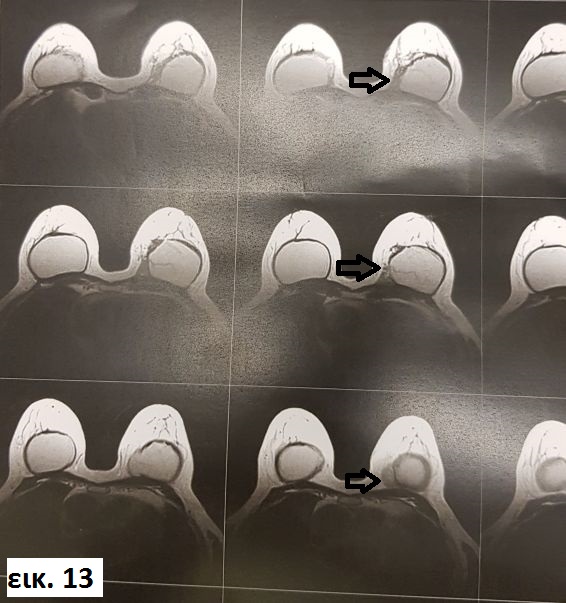Η τρίτη ασθενής είχε υποβληθεί σε αυξητική μαστών προ 40 ετών. Από 6μήνου παρουσίασε ψηλαφητούς όζους στον αριστερό έσω πόλο, οι οποίοι στη μαγνητική τομογραφία φάνηκε ότι οφείλονται σε ρήξη του ενθέματος (εικ. 13).