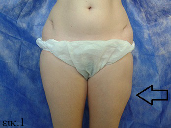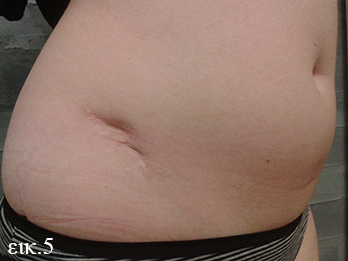 35χρονη ασθενής προσέρχεται στο ιατρείο μας δυο χρόνια μετά από τροχαίο ατύχημα στο οποίο υπέστη πολλαπλά κατάγματα λεκάνης και κάτω άκρων για τα οποία νοσηλεύθηκε σε δημόσιο νοσοκομείο για έναν περίπου μήνα. Η εξωτερική οστεοσύνθεση λεκάνης είχε ως αποτέλεσμα δυο ευμεγέθεις μόνιμες ουλές στα λαγόνια (εικ.3 και 5), ενώ για άγνωστο λόγο έφερε έπαρμα κάτωθεν του σημείου προσπέλασης των ορθοπαιδικών στον αριστερό μηρό (εικ.1 και 3).