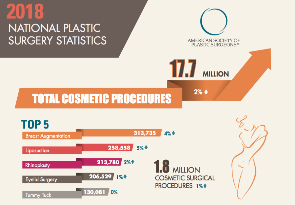 Η Αμερικανική Εταιρία Πλαστικών Χειρουργών (American Society of Plastic Surgeons, A.S.P.S.), μια από τις αρχαιότερες και πιο αξιόπιστες Εταιρίες Πλαστικών Χειρουργών παγκοσμίως, ανακοίνωσε και φέτος τα αποτελέσματα σχετικά με τις διενεργηθείσες χειρουργικές και μη- παρεμβάσεις κατά το προηγούμενο έτος (2018)στις